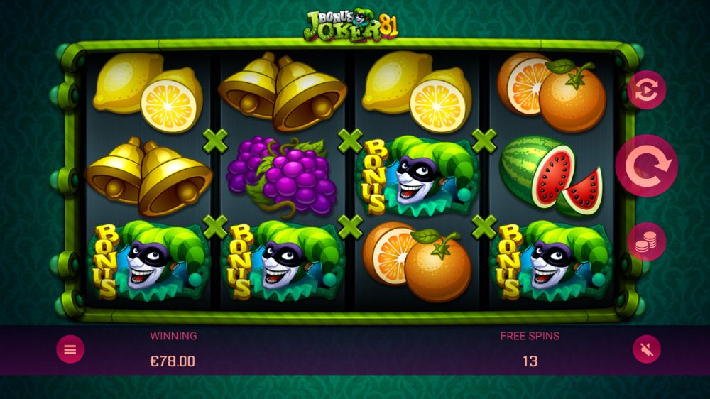 Dostupná je také demoverze výherního automatu Bonus Joker 81. Během hraní si vyzkoušíte manuální točení válci i funkci Autostart. Spustit se vám může i Bonusová hra. Hrát budete s virtuálním herním kontem a virtuální budou i vaše výhry. Chcete-li získat skutečné výhry, tak si musíte tento výherní automat zahrát v některém z online casin za své peníze. Vybrat si můžete třeba z nabídky casin na našem webu.