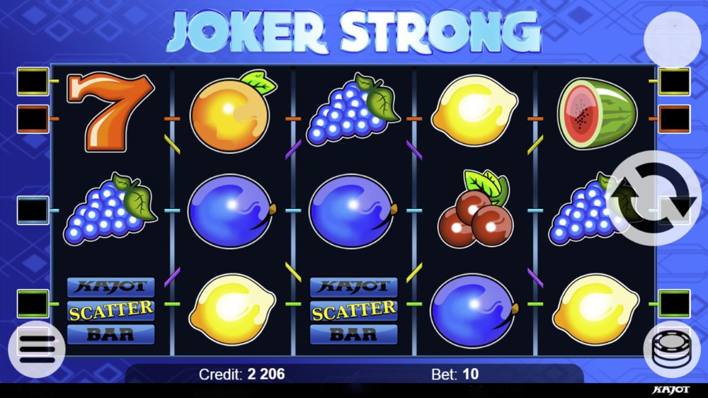 Joker Strong od Kajot Games představuje klasický výherní automat v moderním kabátku, který si zachoval atmosféru tradičních oldschool slotů. Herní prostředí je živé a dynamické, s pestrobarevnou grafikou inspirovanou ovocem, kde dominují zářivé barvy citrusů, švestek a třešní. Motiv Jokera s jeho zlověstným úsměvem dodává automatu trochu temnějšího nádechu, zatímco blikající světla a jemné zvukové efekty připomínají staré herní automaty z kamenných casin.