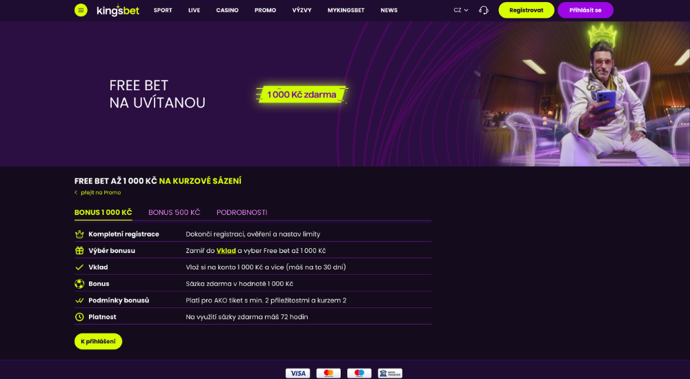 Platforma Kingsbet nabízí novým hráčům uvítací bonus ve dvou variantách. Sportovní free bet až 1 000 Kč nebo casino balíček se 100% bonusem až do výše 555 Kč a 55 free spinů. Vybrat si můžete sami, protože tato volba je jen na vás.