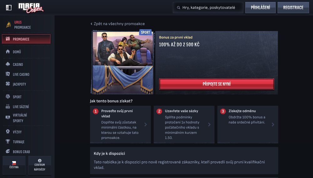 Stačí jen pár kroků a na váš účet může přistát bonus v hodnotě až 2 500 CZK. Jste připraveni zjistit, jak z MafiaCasino vytěžit maximum?