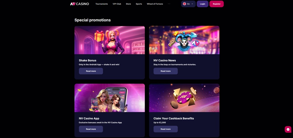 Kromě výše zmíněné denní dávky free spinů jsou všechny ostatní bonusy v NV Casino vázány na podmínku provedení vkladu v minimální stanovené výši. Ať už jde o masivní uvítací balíček do výše až 2 000 EUR + 225 FS, týdenní reload bonusy nebo highroller odměny, vždy je potřeba provést transakci.
