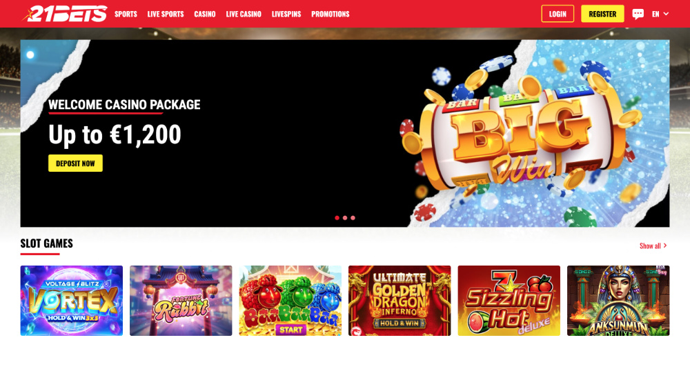 Moderní online platforma 21bets nabízí uživatelsky přívětivé rozhraní, skvělou grafiku a rozmanité herní portfolio, které osloví hráče her i sportovní fandy a příznivce kurzového sázení. Součástí nabídky jsou různé promoakce, non-stop fungující zákaznická podpora, snadno použitelné a bezpečné platební metody. Provozovatelem casina je společnost Famagousta B.V.