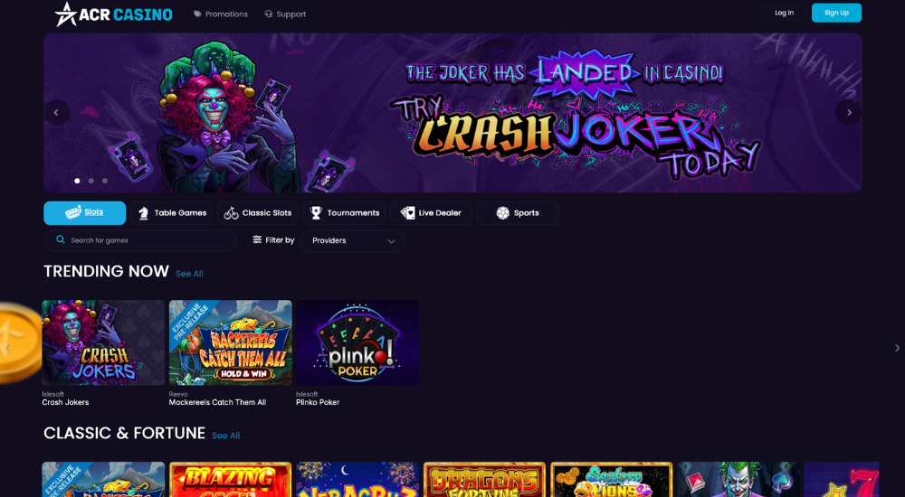 Pokud už znáte ACR Poker, bude pro vás casino sekce známým prostředím. Platforma totiž funguje jako jeden velký ekosystém, kde je váš hráčský účet propojený napříč všemi službami. Web nepůsobí nijak přeplácaně a od první chvíle je zřejmé, že jde především o funkční doplněk k hlavní pokerové nabídce. Rozhodně však nečekejte žádnou chudou hernu – k dispozici máte desítky slotů a spoustu dalších her od prověřených jmen.