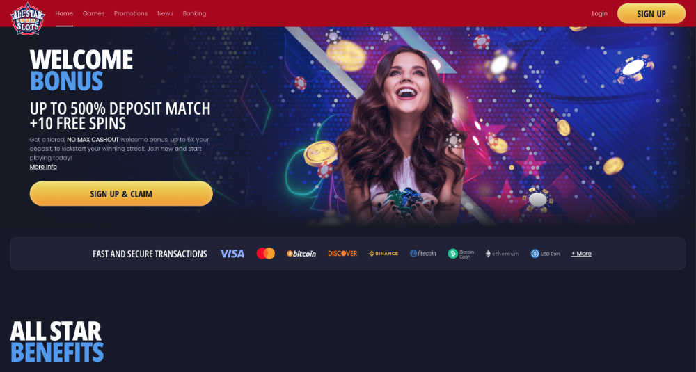 Bonusová nabídka je v All Star Slots casinu postavená tak, aby vás neustále držela ve hře. Těšit se můžete na kombinaci vstupních bonusů a pravidelných akcí přinášejících bonusové peníze i volná zatočení do vybraných her. A tím to ani zdaleka nekončí. Promoakce se v této výherní platformě mění pravidelně a vedle nich na vás čeká ještě i věrnostní program plný dalších odměn.