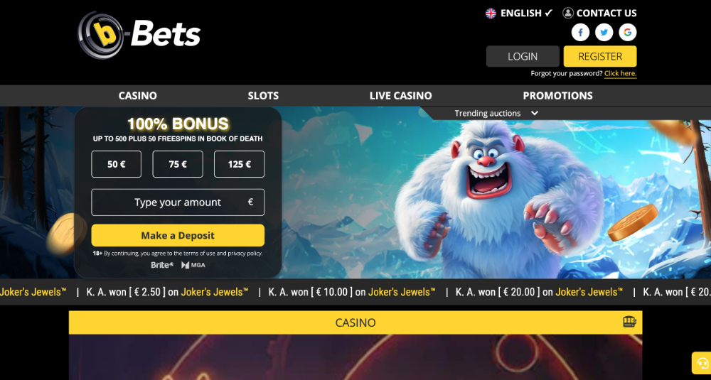 Chcete si užít báječnou jízdu po boku sněžného muže? Díky b-Bets je takový výlet dostupný 24/7, stačí, abyste měli volnou chvilku. Na herní soupisce nejsou jen sloty, ale také zástupci live casina. Máte v oblibě karetní hry? Potom jste srdečně vítáni! Nyní si prohlédneme toto casino trochu podrobněji!