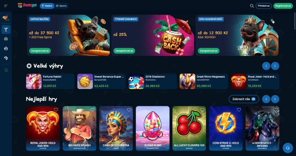 Tmavé pozadí, motiv psa a přitom příjemná atmosféra – BaxterBet umí zaujmout hned na první pohled. Jenže tady nejde jen o hezký kabát: čeká vás licencované casino s českým jazykem, přes 6 000 hrami a programem, který běží jako dobře rozjetý večer. Jednou si dáte automaty, pak sázky, cestou vás chytí turnaj nebo kolo štěstí a najednou máte pocit, že jste „jen na minutku“ už docela dlouho. Pojďme se podívat, co BaxterBet nabízí, jaké bonusy stojí za pozornost a co čekat v praxi.