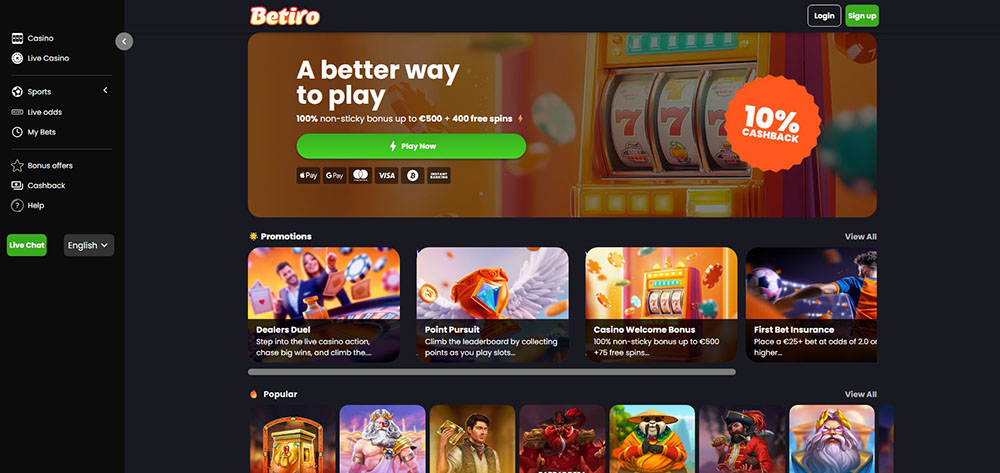 Online platforma Betiro nabízí pestré herní portfolio, které potěší hráče her i sportovní fandy a příznivce kurzového sázení. Hráčům je k dispozici nabídka více než 10 000 her. Hrát můžete oblíbené automaty, vyzkoušet nové sloty, jakožto si užít živé hry s krupiéry. Uživatelsky přívětivé rozhraní nabízí snadnou orientaci. Provozovatelem casina je společnost Igloo Ventures SRL.