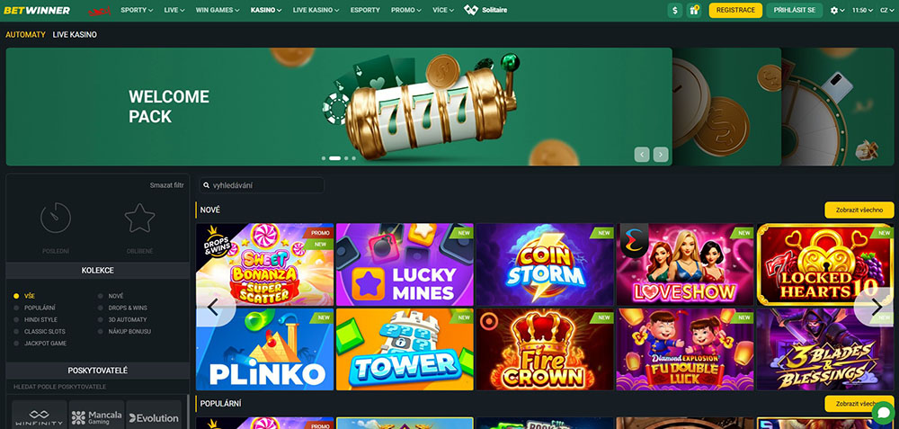 Herní nabídka je rozmanitá a cílí na různé typy hráčů. K dispozici jsou stovky výherních automatů od klasických titulů až po moderní sloty s funkcí Bonus Buy (bonus buy automaty) i progresivními jackpoty. Nechybí ani sekce live casina, kde si zahrajete s živými dealery v reálném čase a vyzkoušíte si klasické stolní hry v online podobě. Součástí platformy je také sportovní sázení a samostatná kategorie pro e-sporty.