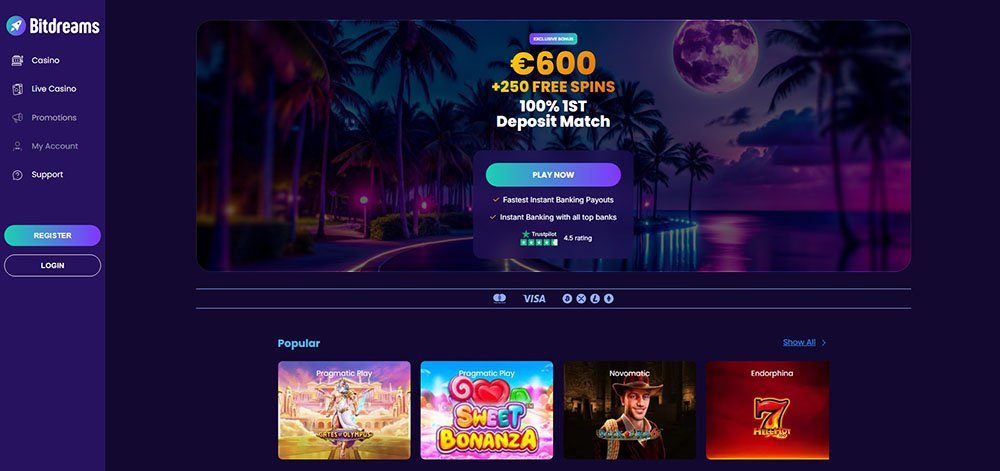 Velké množství hazardních her je pro vás připraveno v casinu Bitdreams. Zahrajete si sloty, stolní a karetní hry, stírací losy, hry s živými krupiéry a games shows. Po registraci obdržíte skvělý uvítací bonus. Lákavé odměny získáte za členství ve VIP programu. Zaregistrujte se a otevřete brány do světa nekonečné zábavy. Nebudete litovat.