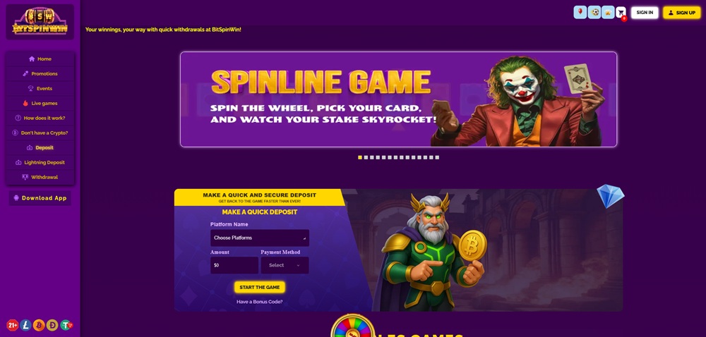 Na BitSpinWin se všechno točí kolem jednoduchého hraní a rychlých transakcí přes kryptoměny. Po vytvoření účtu si hráč zvolí herní prostředí, vloží prostředky a může začít hrát. Platforma nabízí široký výběr titulů a zároveň různé promo akce, které doplňují samotné hraní. Nechybí ani systém ověřování účtu, který je nutný pro plné využití funkcí.