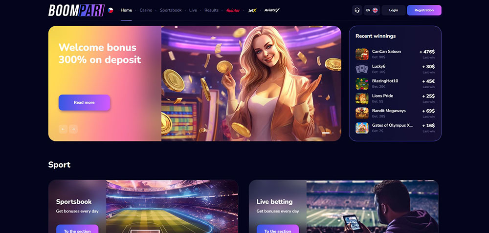 Online casino Boompari zaujme na první pohled moderním tmavým designem s výraznými fialovo-modrými prvky a přehlednou horní navigací. Celé rozhraní působí dynamicky a profesionálně, přičemž důraz je kladen na vizuální přitažlivost i intuitivní ovládání. Platforma kombinuje klasické online casino hry, live casino i sportovní sázení včetně live bettingu. Nechybí ani přehled posledních výher, který dodává webu na autentičnosti a vytváří dojem aktivní komunity hráčů. Jednotlivé sekce jsou logicky uspořádané, takže se mezi nimi lze rychle a bez komplikací pohybovat.
