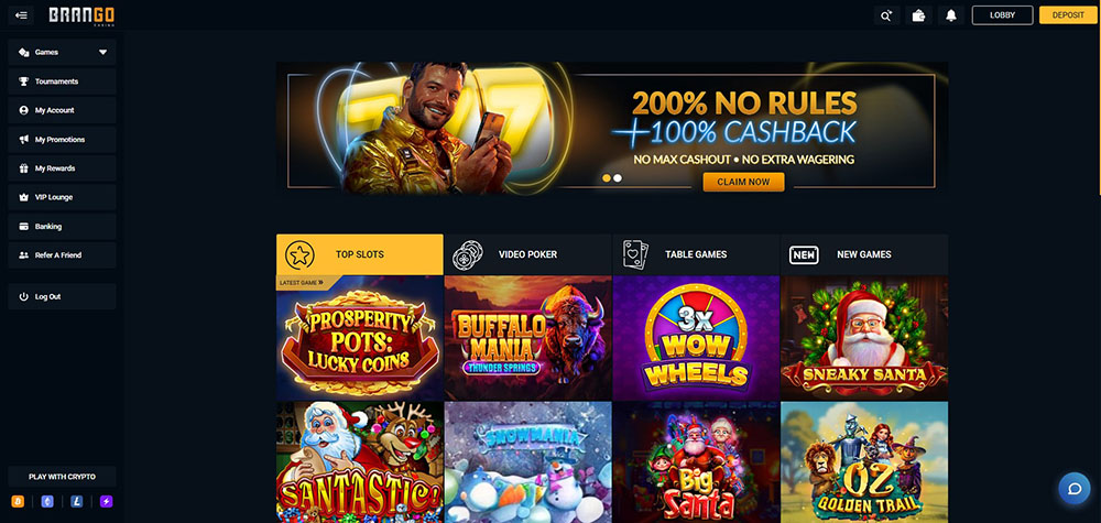 Na webových stránkách je v hlavní roli černá, doplněná bílými a žlutými prvky. Brango Casino je díky tomu skvěle přehledné i pro nováčky. V záložce „Tournaments“ v levé postranní liště se vždy najde něco zajímavého, nezapomeňte ji pravidelně sledovat! Web je v angličtině, což ale nemusí vadit, neboť je to u zahraničních online casin standardem.