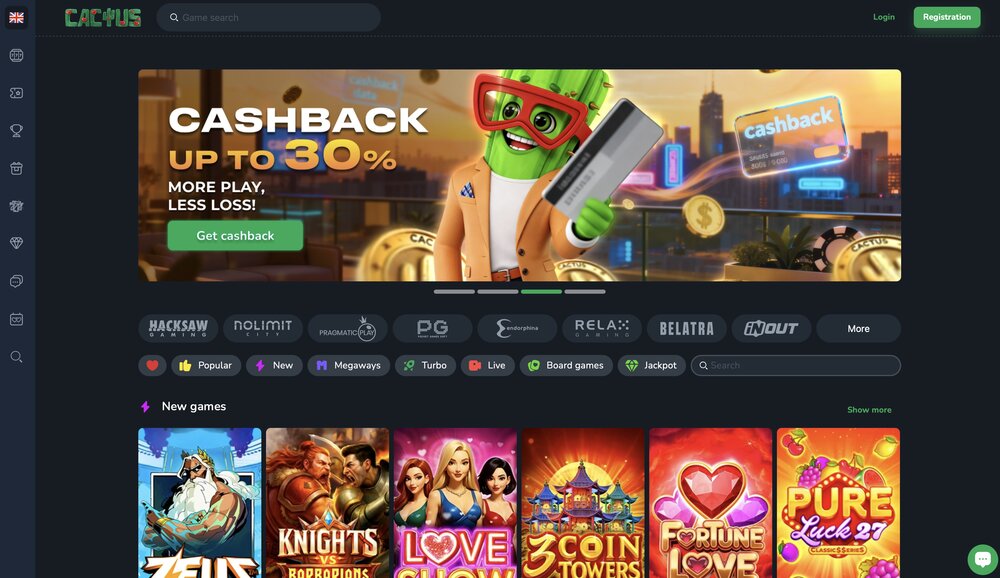 Cactus Casino patří mezi mladší herní platformy, které nešetří na nabídce her ani bonusových akcí. Hráči mohou pod jedním účtem hrát klasické online hazardní hry i tituly s živými dealery a objevovat populární automaty od světových vývojářů. Registrací se otevírá možnost získat uvítací balíček a zároveň přístup k pravidelným bonusům, soutěžím i turnajům. Aktivní hráči mohou využít výhody věrnostního programu, ve kterém sbírají body a získávají cashback bonus.