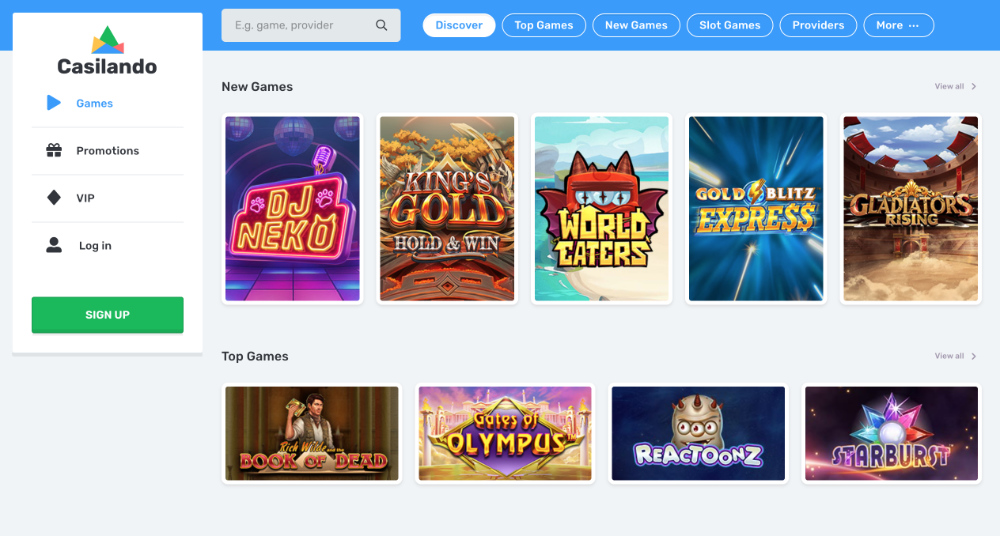 Repertoár her představuje jednu ze silných stránek casina Casilando. Zastoupeny jsou zde tituly mnoha desítek herních vývojářů, včetně předních světových značek jako Pragmatic Play, Spinomenal, Play’n GO, Wazdan, NetEnt a dalších. Zahrát si tak můžete většinu nejpopulárnějších pecek, včetně megahitů, jako jsou hry ze série Gates of Olympus od Pragmatic Play.