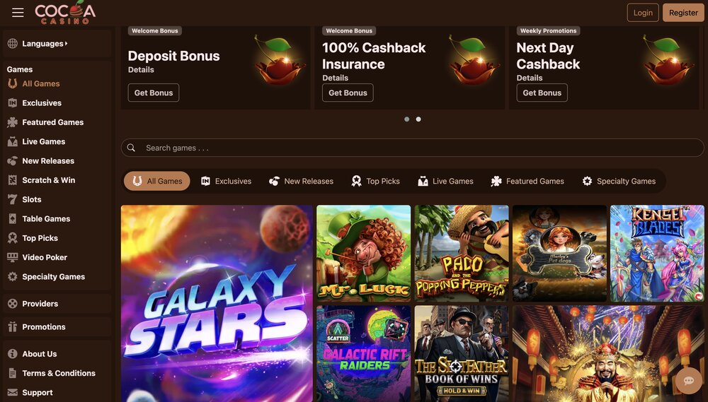 Nejen sloty a live casino, ale také stírací losy, to je aktuální herní soupiska v casinu, kde vládne kakaové potěšení pro chuťové pohárky. Můžete se zaměřit také na oblíbený video poker. Prim zde hraje také bohatá nabídka promoakcí, stejně jako live chat, kde se lze kdykoliv zeptat podpory na vše, co aktuálně řešíte.
