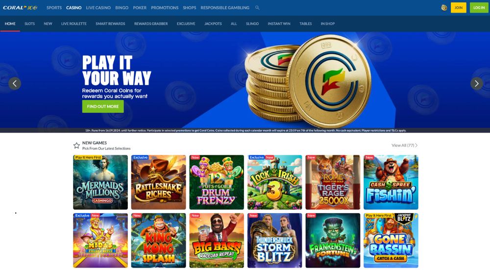 Online casino Coral patří mezi zavedené značky na britském trhu a vedle sportovního sázení provozuje také rozsáhlou casino sekci. Platforma působí přehledně, s jasně rozdělenými kategoriemi jako sloty, live casinem nebo jackpoty. Hlavní stránka zvýrazňuje aktuální promo nabídky a věrnostní program Smart Rewards, který odměňuje pravidelnou aktivitu hráčů. Casino Coral tak kombinuje stabilní zázemí tradiční značky s moderním online prostředím.