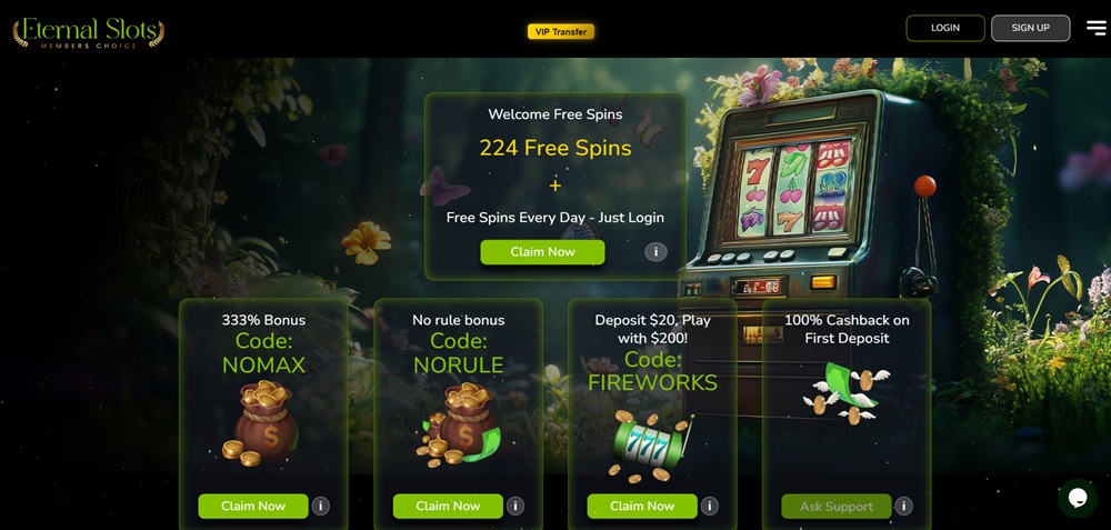 Online casino Eternal Slots je místem, kde si užijete spoustu zábavy. Po své registraci můžete čerpat uvítací bonus, který si vyberete ze tří zajímavých nabídek. Vzrušující čekání na atraktivní výhry si zažijete během hraní slotů a stolních a karetních her. Těšit se můžete na hry ruleta, blackjack, baccarat, poker, keno či plinko. Chvíle strávené v Eternal Slots vám zpříjemní lákavé reload bonusy. Skvělé výhody vám poskytne VIP program. Tak na nic nečekejte a pojďte se pobavit.
