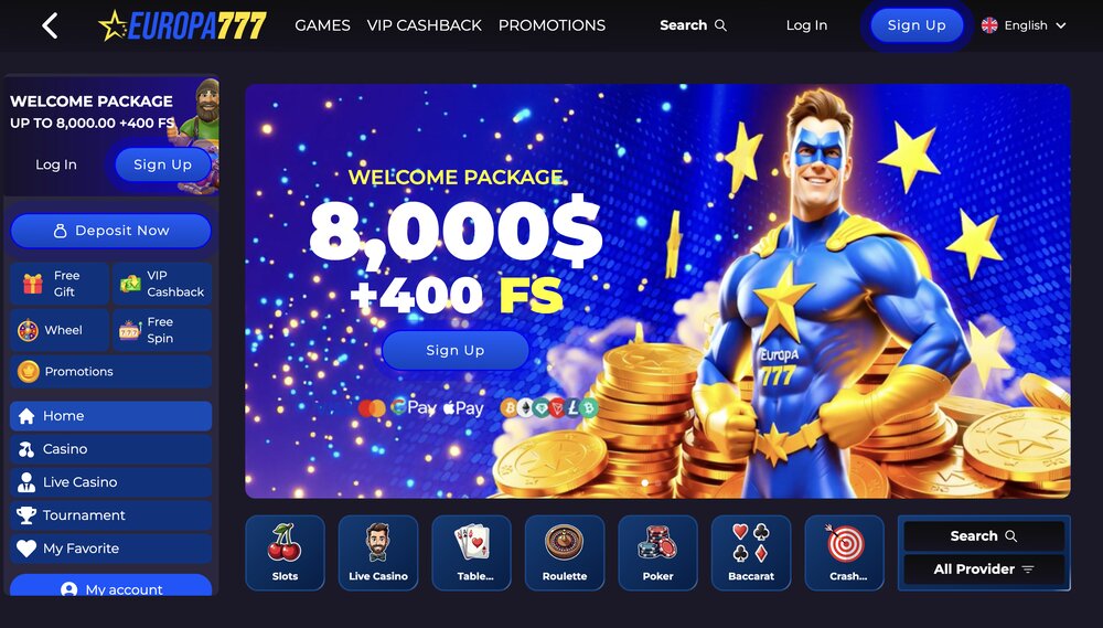 Casino Europa777 staví na modrém vizuálu a motivu štěstí, který je na webu vidět skoro všude – od kola štěstí přes uvítací balíček až po promoakce a cashbacky. Prostředí působí hravě, ale zároveň přehledně, takže se v něm dá rychle zorientovat i při první návštěvě. Hned z úvodu je vidět, že platforma chce hráče táhnout hlavně na pravidelné odměny, live casino a VIP výhody, ne jen na jednu titulní akci.