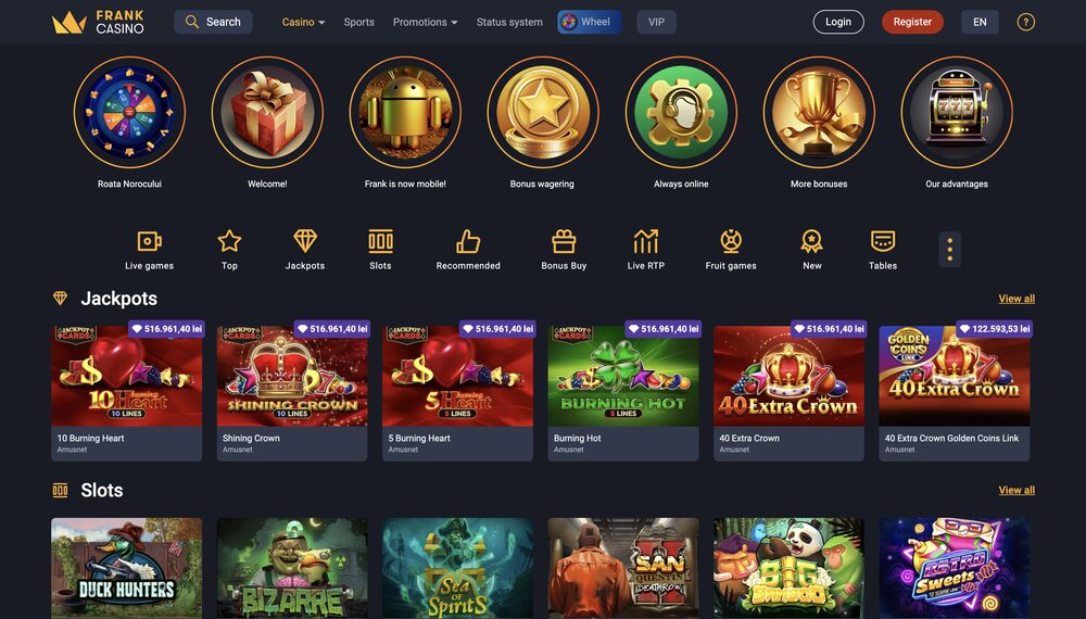Frank Casino je rumunské online casino, které na trhu působí od roku 2021 a nabízí hráčům pestrou herní knihovnu od více než 22 poskytovatelů her. Najdete zde moderní automaty, jackpoty, stolní hry i bohatý výběr live her s reálnými dealery. Casino se zaměřuje na snadné a přehledné hraní bez zbytečných komplikací, přičemž podporuje širokou škálu platebních metod pro vklady i výběry. Kryptoměny však v nabídce chybí, takže transakce probíhají pouze tradičními kanály. Díky intuitivnímu rozhraní a rozsáhlým herním možnostem si zde každý hráč najde to své.