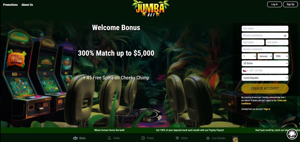 V casinu Jumba Bet vás přivítá výrazná grafika a autentická atmosféra, díky které budete mít pocit, jako byste se prodírali zarostlou džunglí ukrývající nepřeberné bohatství. Těšit se můžete na propracovanou grafiku, snadnou ovladatelnost a možnost zahrát si kdykoliv a kdekoliv. Ať už toužíte po pořádné porci zábavy nebo chcete vyhrát pěkně tučný balík peněz, v Jumba Bet jste zaručeně na tom správném místě.
