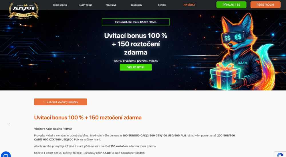 Dnes už to není aktuální, protože se nabídka promoakcí obvykle v čase mění a přichází novinky. V minulosti jste mohli využít no deposit bonus, který nabídl 5 EUR, resp. 120 Kč do začátku všem hráčům. Jaká byla jeho pravidla? Dokončit registrační proces bez přerušení, stejně jako například ověřit e-mail a telefon. Samotný bonus bylo možné využít výhradně na herní sestavu v sekci Kajot Prime. Nyní si představíme nejnovější bonus za registraci, který nabízí 2 500 Kč k prvnímu vkladu. Jaké další podrobnosti byste o něm měli znát?