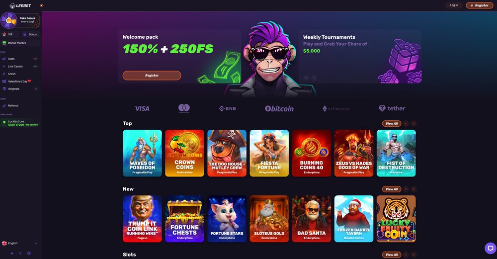 V hlavní roli je veselý opičák! Chcete na návštěvu do tohoto casina? LeeBet je světem, kde se setkáte s předními herními developery a užijete si skvělý bonus na uvítanou. Co dalšího byste ještě měli vědět? Podpora kryptoměn určitě potěší moderní hráče, stejně jako bohatá nabídka turnajových příležitostí. Následující přehled vám nabízí odpovědi na všechno!
