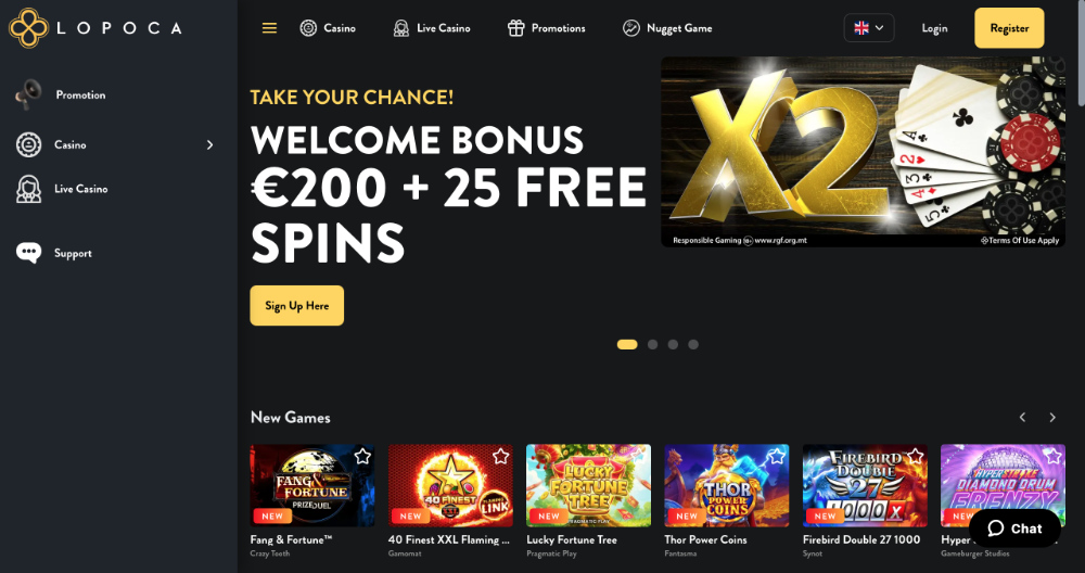 Úvodní obrazovka casina Lopoca je postavená kolem výrazného banneru s aktuální promo akcí. Doplněná je přehledným horním menu. Odtud se snadno dostanete do sekcí Casino, Live Casino, Nugget Game a Promotions.