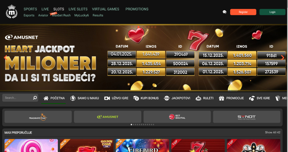 Herní nabídka v casinu je postavená na velmi širokém spektru titulů, kde hlavní roli hrají výherní automaty, ale nechybí ani live casino a další speciální herní sekce. Na webu najdete jak klasické sloty, tak moderní formáty typu Megaways, Hold & Win, Drops & Wins nebo exkluzivní jackpotové hry. Výrazným prvkem je také ruleta, včetně speciální Belgrade Roulette, což je lokální značka/edice živé rulety, kterou provozuje společnost MaxBet casino přímo ze svého studia nebo casina v Bělehradě.
