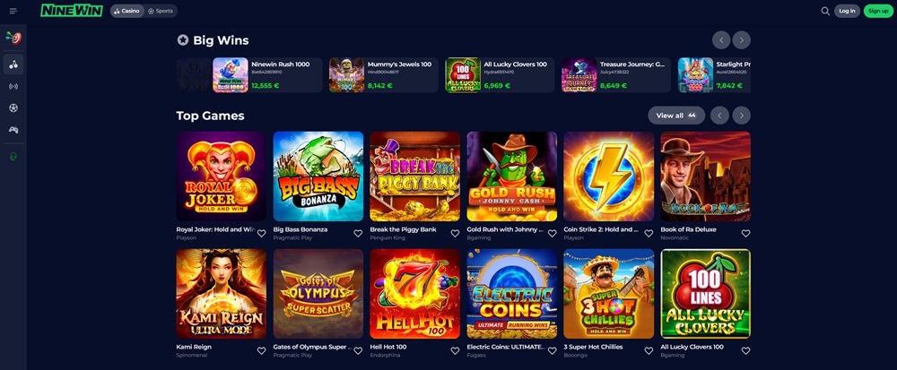 V casinu NineWin si zahrajete tisíce hazardních her od předních světových poskytovatelů. Jsou jimi například Pragmatic Play, Playson, BGaming, Booongo Games či Evolution. Velkou část her tvoří výherní automaty. V nabídce nechybí Big Bass Bonanza, Sweet Bonanza, Book of Fallen, Sugar Rush, Wolf Gold či Bonanza Billion. Mezi stíracími losy naleznete třeba Scratch Match, Ice Scratch Gold nebo Scratch Alpaca Silver.