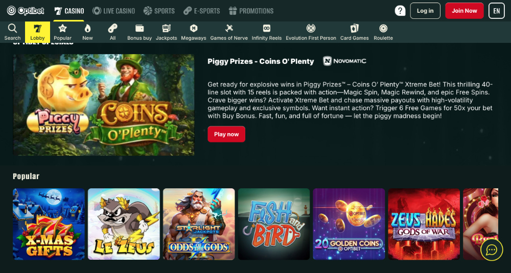 Úvodní stránka casina Optibet nabízí přehledné horní menu, ve kterém najdete sekce Casino, Live Casino, Sports, E-Sports a Promotions. V pravé části horní lišty je k dispozici přihlášení k účtu, přepínač jazyka, ikona nápovědy, zpráv a tlačítko Deposit Now pro rychlý vklad. Pro okamžitý kontakt s podporou slouží také ikonka live chatu v pravém dolním rohu stránky, která je dostupná z jakékoliv části webu.