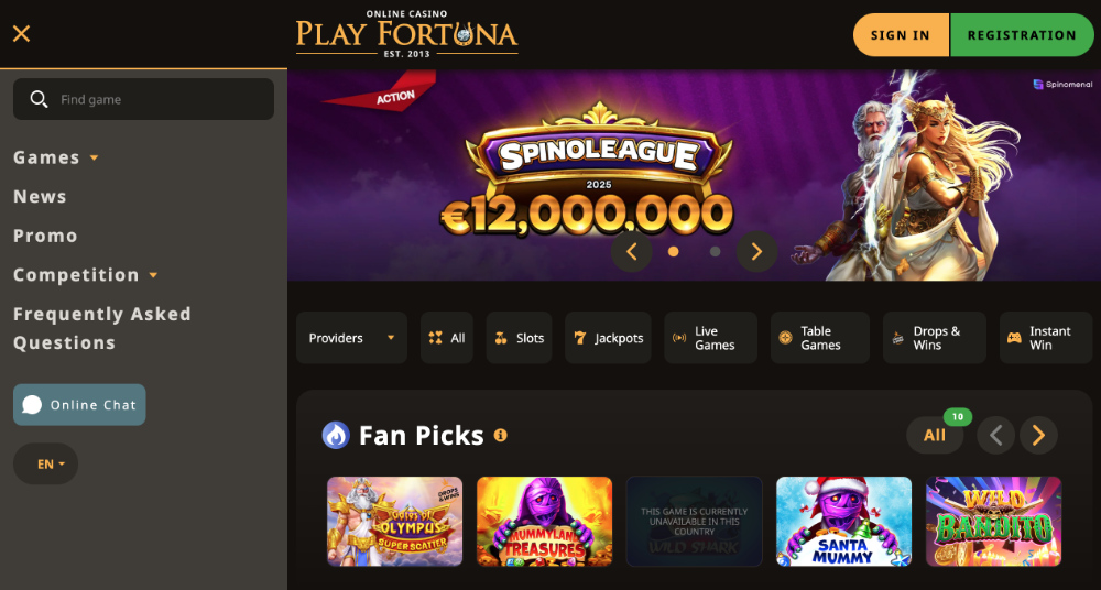 Už při prvním otevření zaujme Play Fortuna casino moderním tmavým designem a logicky uspořádanými herními sekcemi, díky nimž se hráč rychle zorientuje a snadno najde obsah, který ho opravdu zajímá.