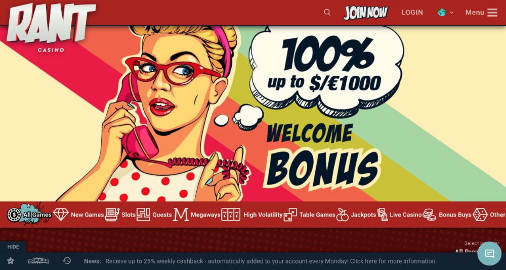 Zapomeňte na studenou přírodu a přelidněné město. Zalezte si na gauč, pusťte si hudbu jako kulisu a otevřete casino RANT Casino. Uvítá vás zajímavá grafika ve stylu komiksu.