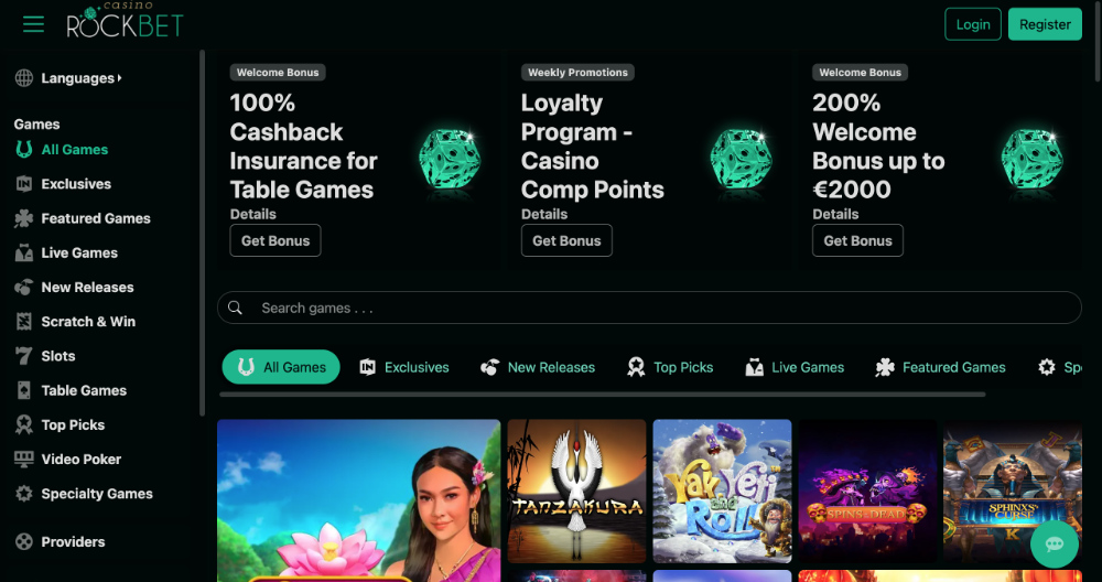 Silnou stránkou internetového casina Rockbet je bohatá nabídka her, která osloví nováčky, ostřílené i náročné hráče. Zahrát si můžete populární online hazardní hry, jako jsou evropská a americká ruleta, blackjack, poker, baccarat či zkusit štěstí u jednoho z mnoha výherních automatů s jackpotem. Sekce „Live casino“ nabízí možnost si zahrát s živými dealery.