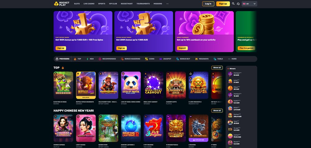 Vstoupíte na stránky a hned víte, kde co je. Casino RocketPlay vsadilo na přehlednost – jasné sekce, přehled výher, velký prostor pro promoakce a vše dobře dostupné na pár kliknutí. Silnou stránkou jsou právě bonusy a pravidelné akce, které se neomezují jen na uvítací nabídku. K tomu přidejte turnaje, loterie, mise s odměnami a herní obchod, kde proměníte nasbírané body ve free spiny nebo peněžní ceny. Na výběr máte celou řadu platebních metod včetně kryptoměn, a pokud patříte mezi věrné hráče, VIP program vás odmění způsobem, který skutečně pocítíte.