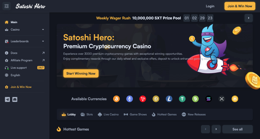 Satoshi Hero je crypto casino, které sází na jednoduchý a přehledný layout, takže se v něm rychle zorientuje každý hráč. Web je dostupný ve 12 jazycích, přičemž čeština mezi nimi zatím chybí. Platby fungují výhradně přes kryptoměny, klasické metody jako karty nebo bankovní převody nejsou podporovány. Minimální vklad činí 10 €, výběr začíná od 20 €. Týdně je možné vybírat až 8 600 € nebo 34 000 € měsíčně, případně ekvivalent v jiné kryptoměně. Nabídka her je bohatá, protože Satoshi Hero spolupracuje s více než 35 poskytovateli her. Celkově je platforma ideální pro ty, kteří preferují kryptoměny a jednoduché, přehledné prostředí.