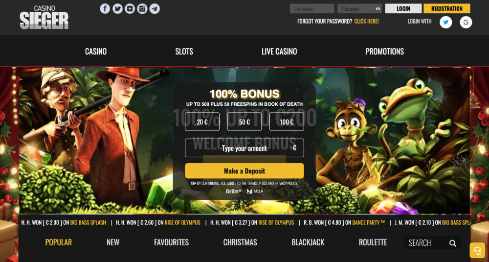 Tato výherní platforma vás vezme na výpravu do zarostlé džungle, ve které namísto záhadných artefaktů můžete objevovat hráčské příležitosti. Připravená je pro vás bohatá nabídka her, spousta štědrých promoakcí a mnoho dalších atraktivních bonusů a odměn, které vám pomohou užít si hru naplno a vytěžit z ní maximum. Seznamte se s Casino Sieger a užijte si jeho divokou atmosféru na vlastní kůži.