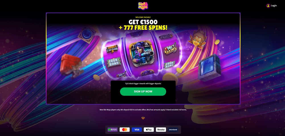 Uvítací balíček v online casinu Slot Mojo je rozdělen do šesti po sobě jdoucích vkladů, díky kterým mohou noví hráči postupně získat bonusy až do výše 1 500 EUR a celkem 777 free spinů. Pro aktivaci jednotlivých částí balíčku je nutné provést vklad alespoň 20 EUR, přičemž každá fáze bonusu je navázána na konkrétní slotovou hru. První vklad nabízí 100% bonus až do 500 EUR na slot Iron Bank. Druhý vklad přináší až 250 free spinů na hře Templar Tumble.