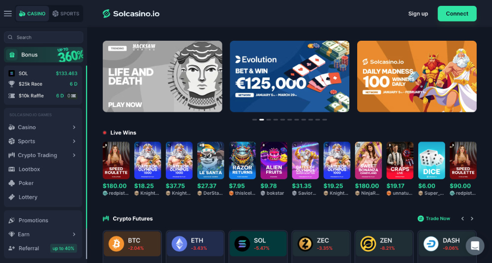 Solcasino.io je moderní online casino postavené na web3 technologiích, které spojuje kryptoměny, širokou nabídku her a důraz na rychlé a transparentní hraní.