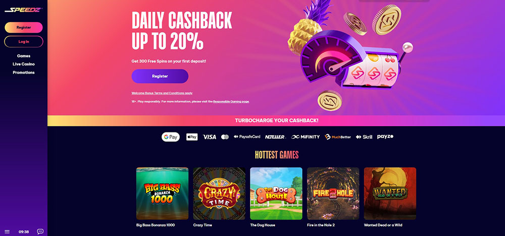 Na první pohled působí online casino Speedz jako dynamická herní platforma, která sází na jednoduché ovládání a rychlý přístup ke hrám. Domovská stránka upozorňuje především na aktuální bonusové nabídky a vybrané tituly z herní knihovny. Hráči zde mohou vybírat z různých kategorií her a využívat také promoakce, které casino pravidelně připravuje. Součástí nabídky jsou i další odměny určené pro aktivní hráče.