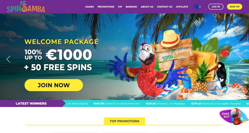 Užijte si herní party v casinu Spin Samba. Pestrá nabídka her, atraktivní promoakce a exkluzivní odměny pro věrné hráče nabízí skvělou zábavu plnou vzrušení, adrenalinu a napětí.