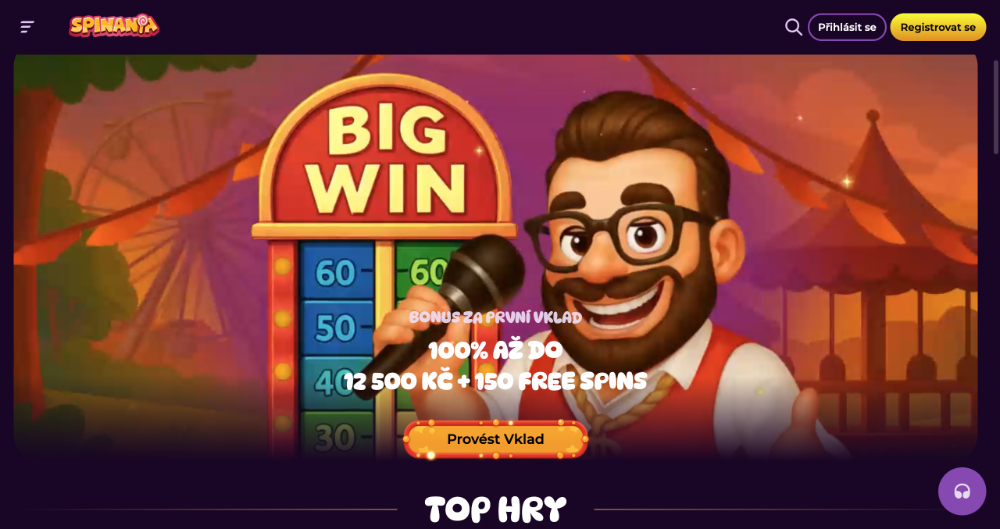 Spinania casino zaujme už na první pohled svým hravým, moderním designem, kterému dominuje výrazný maskot – usměvavý akční chlapík, který se objevuje napříč celým webem i promoakcemi. Právě díky němu působí prostředí casina odlehčeně a přívětivě. Hráči zde najdou širokou škálu bonusových nabídek, od uvítacího bonusu na první vklad až po další vkladové bonusy, turnaje, loterie nebo cashback. Všechny promoakce jsou prezentovány jasně a na jednom místě, díky čemuž se v nabídce rychle zorientujete a vyberete si bonus podle chuti.