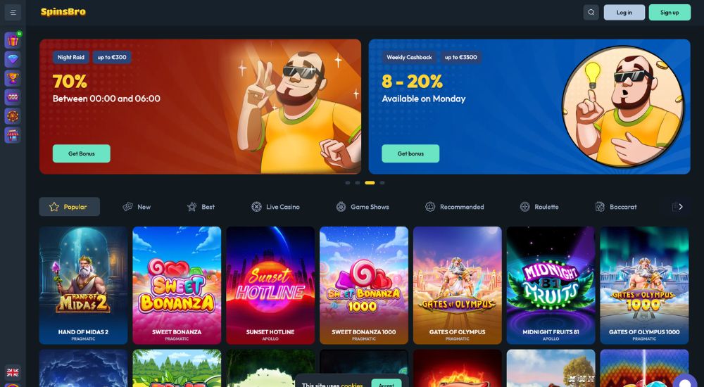 Casino SpinsBro vás hned při prvním vstupu naprosto pohltí. Jeho design je svěží, moderní a výrazný, a přitom si zachovává přehlednost i intuitivní ovladatelnost. Během chvilky se v něm budete cítit jako ryba ve vodě a pár kliknutími si zvládnete vyhledat přesně to pravé. Lákají vás online sloty nebo raději hrací stoly? Pak jste rozhodně na tom správném místě! V tomto online casinu si vybere zaručeně každý.