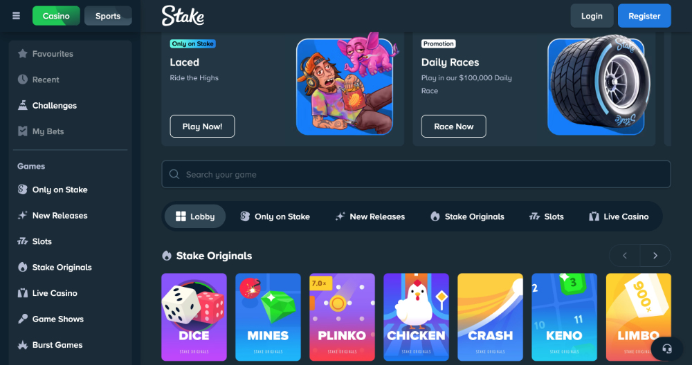Casino nabízí tisíce her od renomovaných poskytovatelů, jako jsou BGaming, Endorphina, Microgaming a další. K dispozici jsou Stake Originals a Stake Exclusives, tedy exkluzivní hry, které jinde nenajdete. Automaty jsou zastoupeny širokou škálou titulů, od oblíbených klasických slotů jako Sweet Bonanza, Starburst, Gates of Olympus a Book of Dead až po progresivní jackpoty, například Mega Moolah nebo Divine Fortune, kde lze vyhrát opravdu vysoké částky.