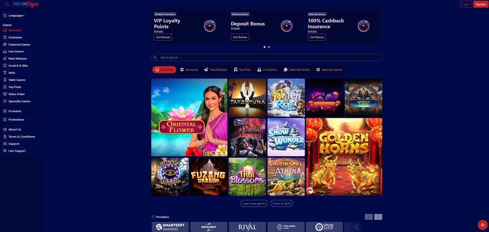 Úvodní stránka casina This is Vegas je jednoduchá a dobře se v ní orientuje. V levém horním rohu je logo a rozbalovací menu, které slouží jako hlavní rozcestník celého webu.
