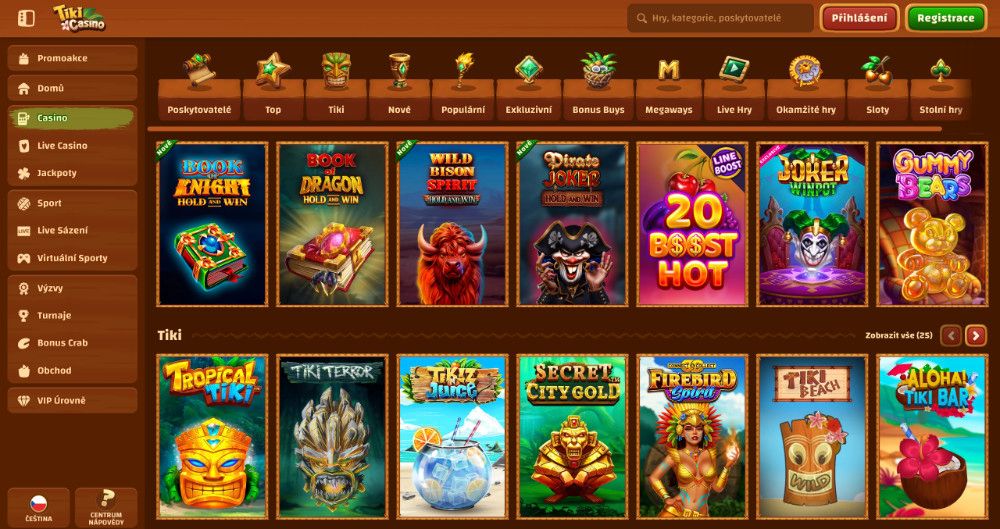 Herní knihovna Tiki Casina je rozdělena do kategorií, jako jsou Top hry, Nové, Populární, Exkluzivní, Bonus Buys, Megaways, Live hry, Okamžité hry, Sloty nebo Stolní hry. Hráči si mohou vybírat mezi klasickými i moderními automaty, ovocnými sloty, jackpotovými hrami, herními show i živými stoly, jako je ruleta, blackjack nebo baccarat.