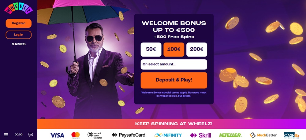 Můžete se těšit až na 500 EUR a 500 FS, stačí splnit všechny nastavené podmínky. Welcome Bonus v casinu Wheelz je opravdu štědrý!