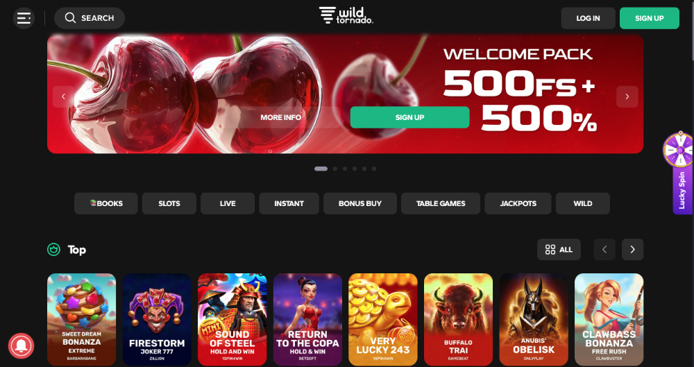 Zábava je v casinu WildTornado vzrušující a dynamická od samého začátku. Pro nové hráče je k dispozici štědrý uvítací bonus ve výši 500 % + 500 free spinů. Podmínkou je minimální vklad 20 EUR či ekvivalent v jiné měně a 40× protočení. Podmínky protočení musí být splněny do 3 dnů od aktivace bonusu. Vstupní bonus je rozdělen do 6 vkladů, a to následovně: