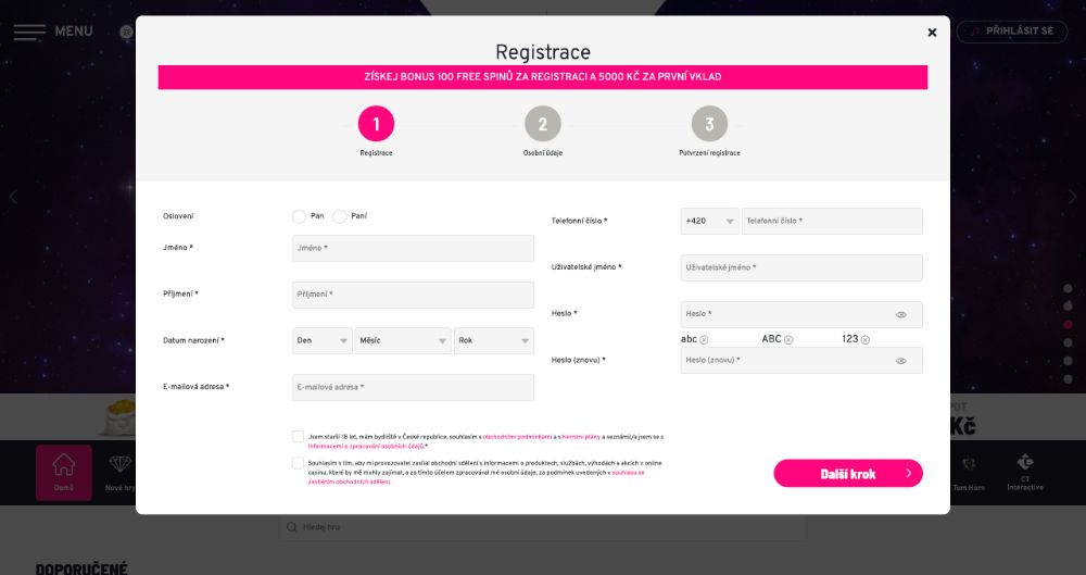 Registrace v Apollo Games se v základu skládá ze tří povinných kroků. Nejprve jste jako noví hráči vyzváni, abyste vyplnili své křestní jméno a příjmení, celé datum narození, e-mailovou adresu, telefonní číslo a nastavili si uživatelské jméno a heslo (musí obsahovat alespoň jedno malé a velké písmeno a číslici), které pro kontrolu ještě jednou zopakujete.