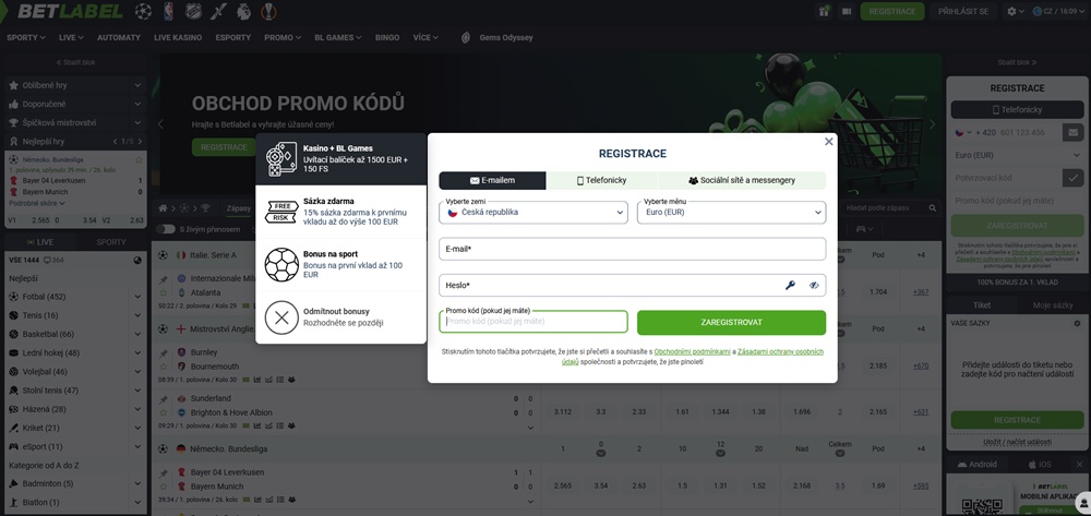 Na platformě BetLabel se promo code zadává přímo během registrace nového účtu. V registračním formuláři najdete pole s označením „Promo kód (pokud jej máte)“. Právě do tohoto pole hráč kód zadá ještě před dokončením registrace.