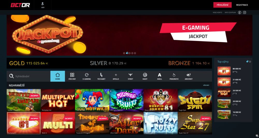 Herní nabídka je postavená hlavně na e-gamingu. To znamená tři věci: české prostředí, známé hry a pravidelné přidávání čerstvých titulů ještě dřív, než je nabídnou jiná casina. Vedle e-gamingu tu najdete také sloty od herních poskytovatelů Tech4Bet, Synot Games, Apollo Games, Kajot Games, Pragmatic Play nebo Amusnet, a přestože filtr není nijak komplikovaný, vyhledávání je rychlé a jasné.